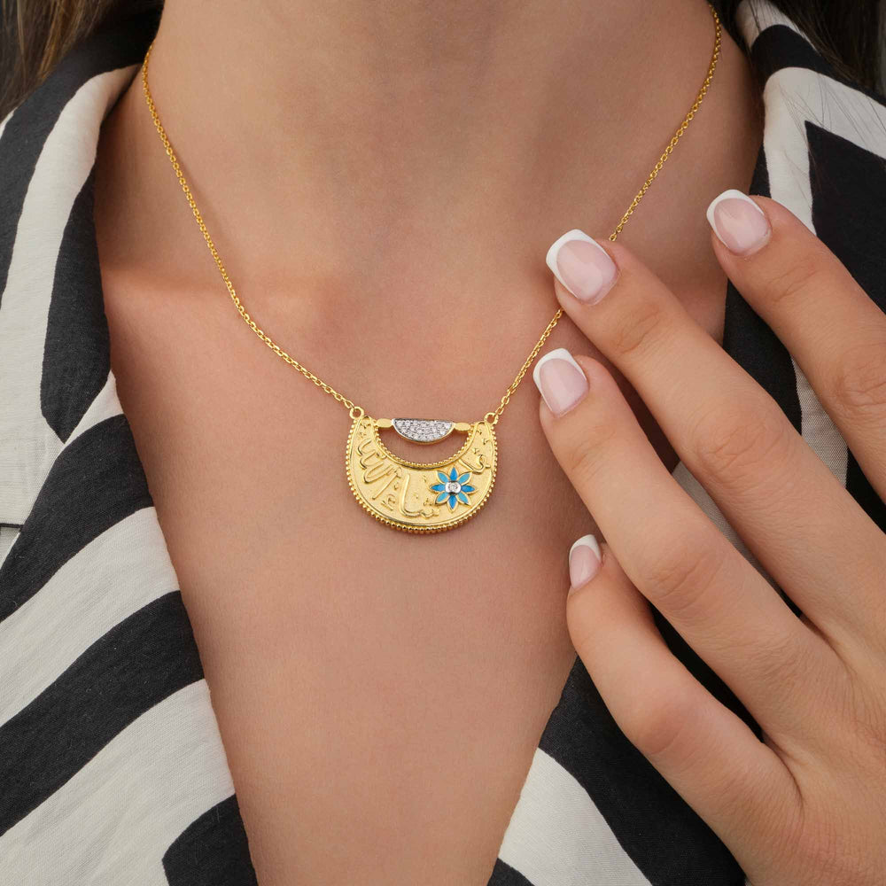 This Mashallah Diamond necklace is a stunning and unique piece that features a beautiful enamel flower accent and sparkling moissanite stones. It is perfect for anyone looking to add a touch of elegance and sophistication to their wardrobe. The necklace is crafted with precision and only the highest quality materials, making it a valuable addition to any jewelry collection.