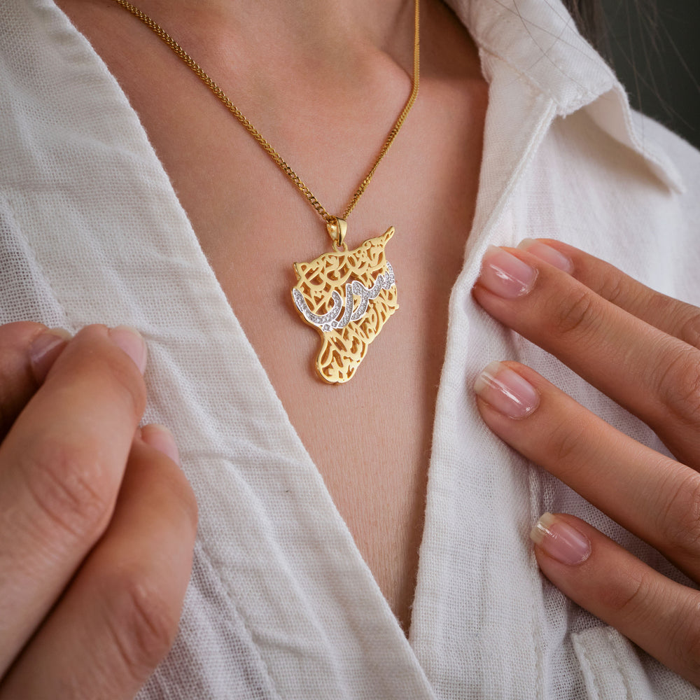 Syria Map Necklace with Arabic Calligraphy Diamonds