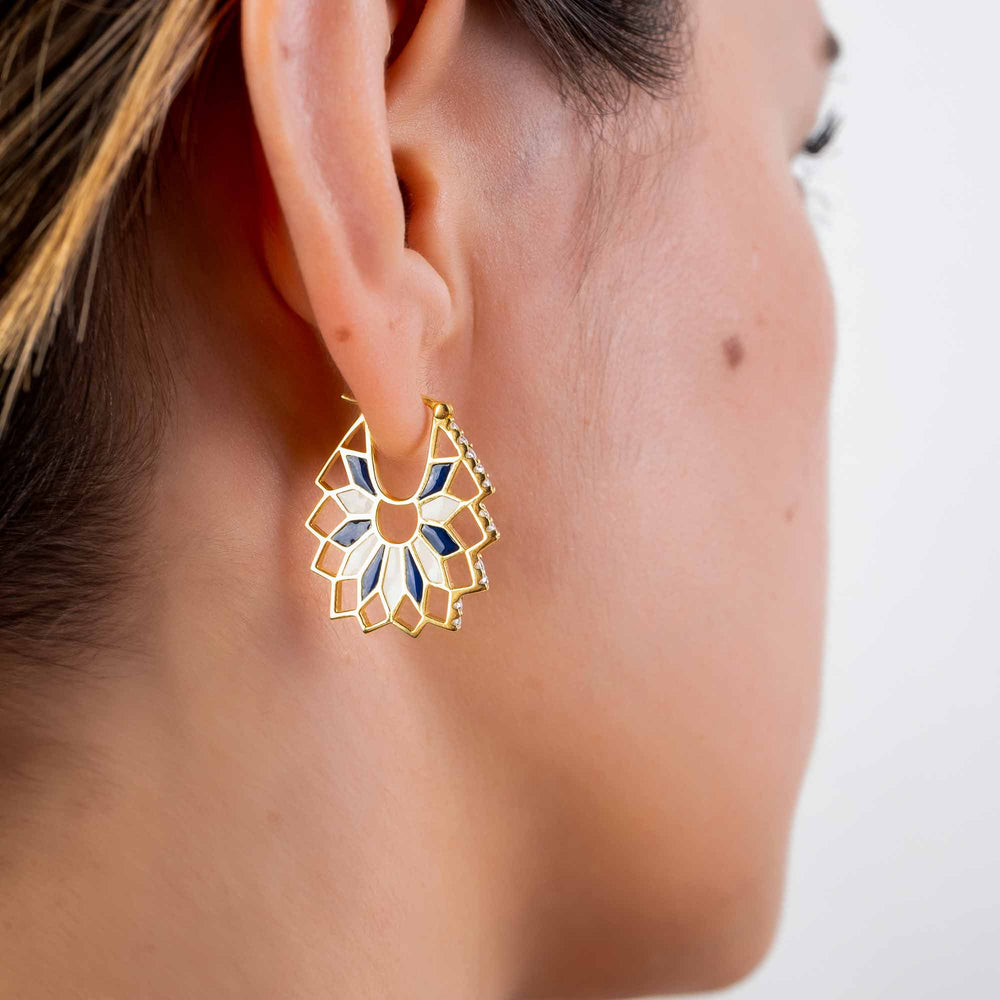 Inspired by Mediterranean tilework, the Mosaic Earrings feature intricate blue and white enamel set in gold plating. Subtle sparkling accents add a touch of elegance, making them a perfect statement piece for any occasion. Lightweight and timeless, they’re designed for effortless sophistication.